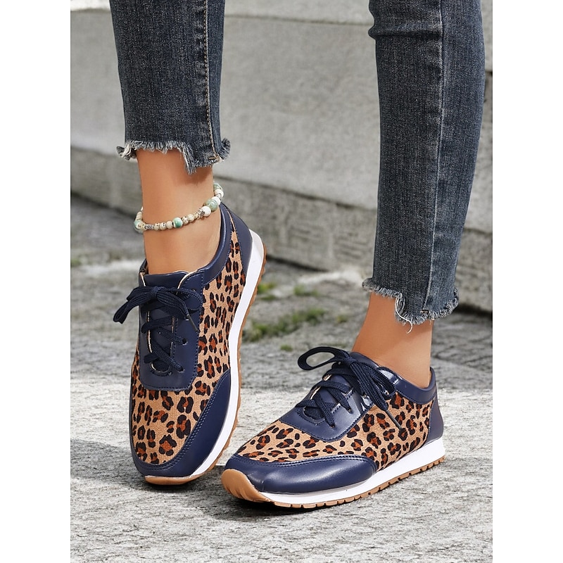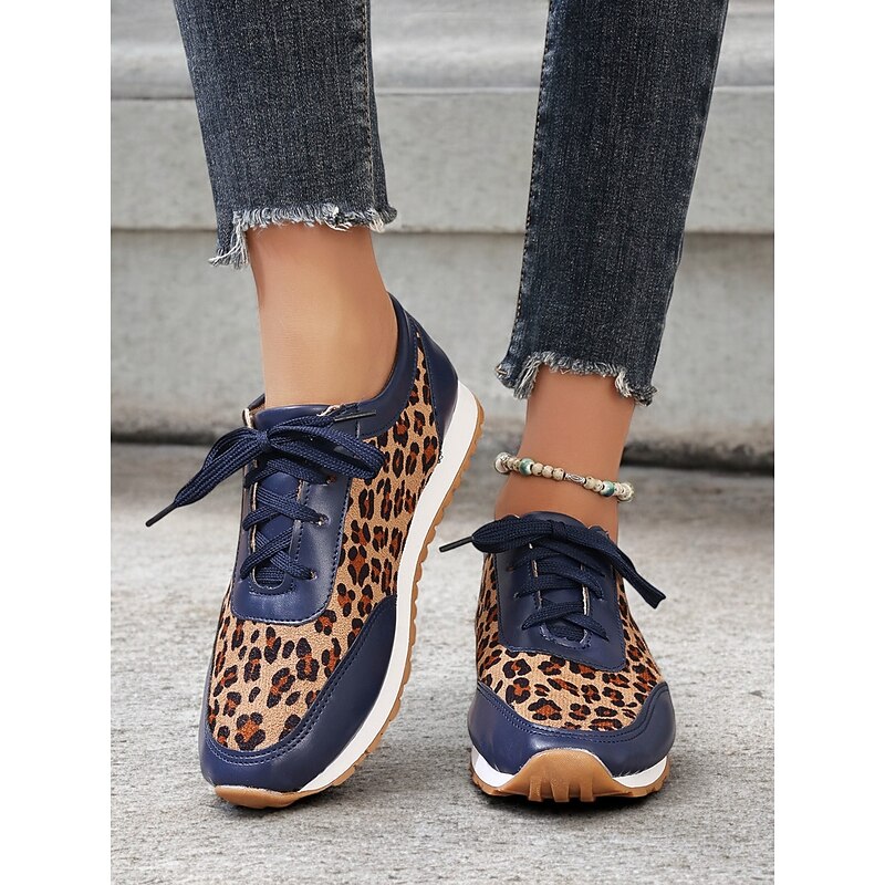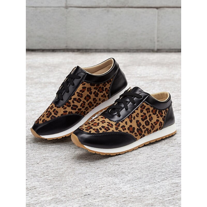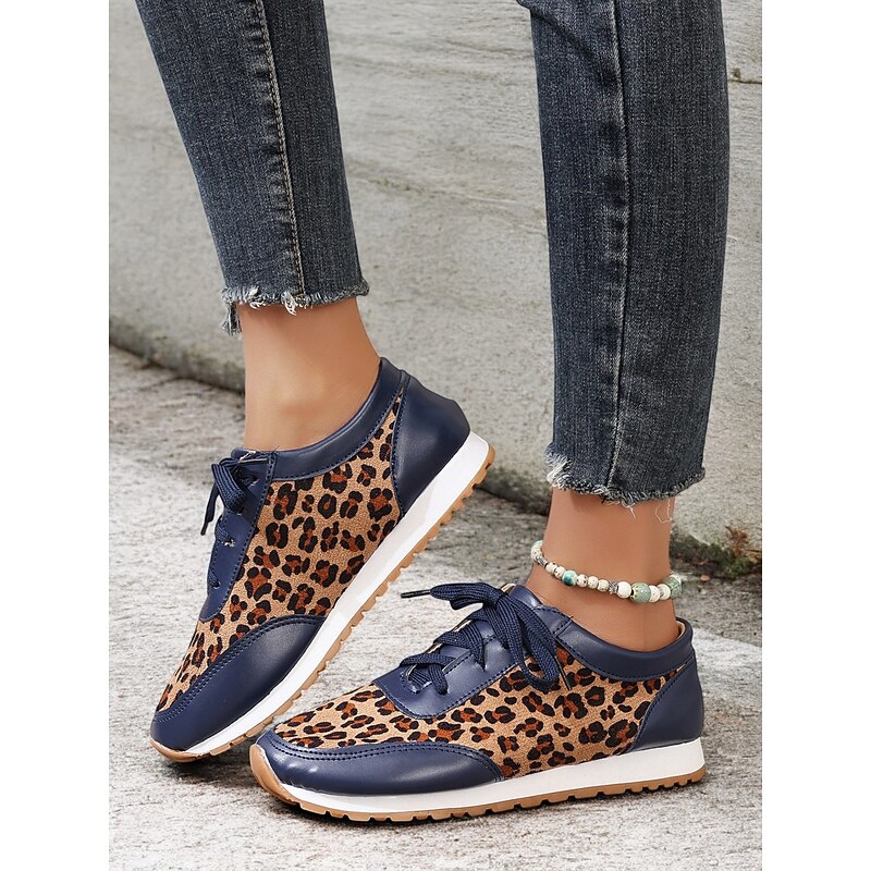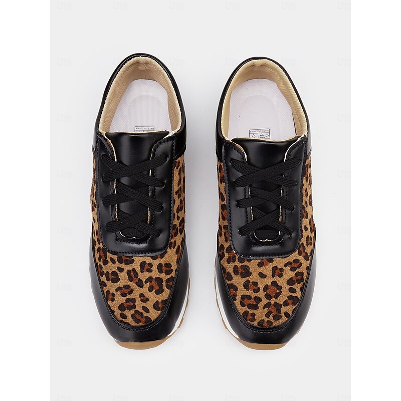 Highlights [Fabric and Material] : Crafted with a combination of faux leather and faux suede, these women's sneakers offer a stylish and durable design. The soft fabric upper ensures comfort throughout the day, while the black synthetic leather accents add a sleek, sophisticated contrast to the trendy leopard print pattern. [Style and Fit] : Featuring a flat heel and a round toe, these sneakers are tailored for a casual and comfortable fit. The lace-up closure allows for a customizable fit, ensuring they provide both style and practicality for everyday wear. [Design Highlights] : The standout leopard print design is complemented by black accents, creating an eye-catching and fashionable look. The cushioned interior enhances comfort, while the robust rubber outsole ensures excellent traction and grip. [Occasions] : Ideal for daily wear, these trendy sneakers add a bold statement to casual outfits. Perfect for everything from running errands to casual outings, they are designed to elevate any everyday ensemble with ease. [Size Range] : Available in a variety of sizes, these sneakers cater to a wide range of preferences. The sizes include US6 to US10.5, allowing you to find the perfect fit for a comfortable and stylish experience.