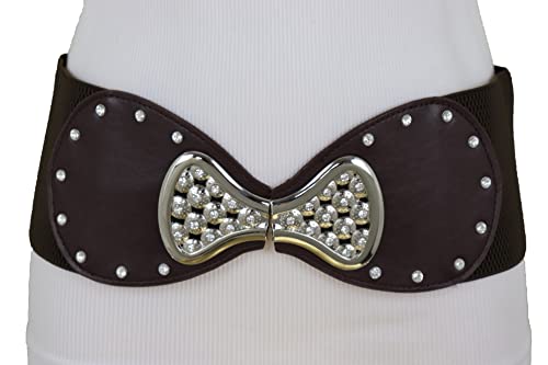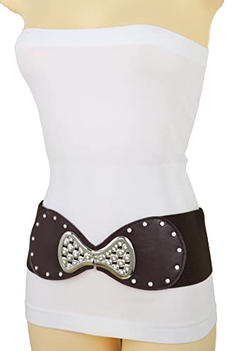 Women Elastic Fashion Belt - Hip Waist Silver Metal Bow Tie Ribbon Buckle S M Dark Brown 1