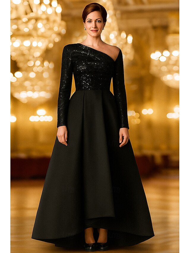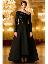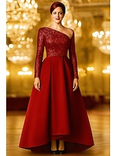 More information about Black Red A-Line Evening Gown Elegant Dress Formal Wedding Asymmetrical Long Sleeve One Shoulder Pocket Satin with Glitter Shawl 2025