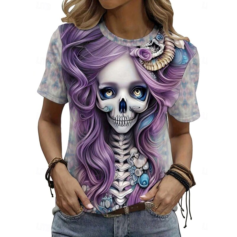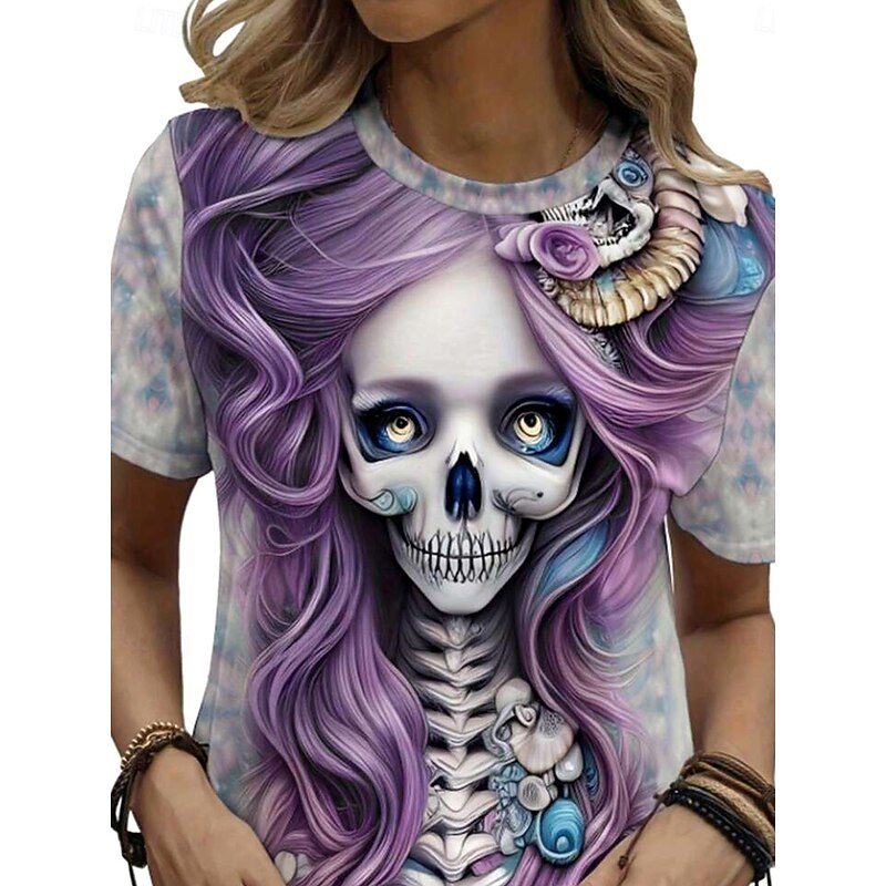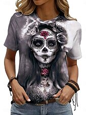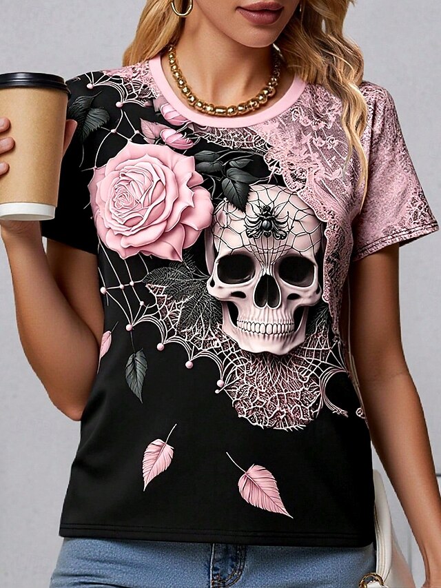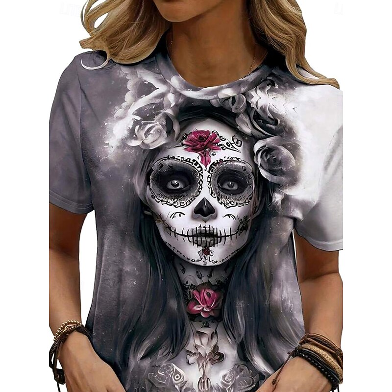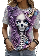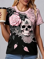 More information about Halloween Women's T Shirt Skulls Floral Graphic Vintage Stylish Classic Short Sleeve Crew Neck Regular Tops Daily Weekend Print Pink Purple Gray Summer Spring Fall