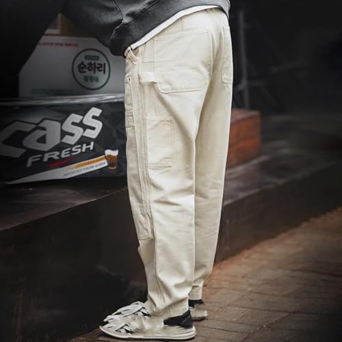 Jeans Pants Trouser Denim Workwear Vintage Distressed Loose Beige Washed Classic Multi Bag Logging for Men 4