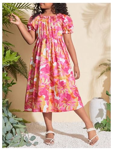 Girl's Floral Ruffle Summer Dress Short Puff Sleeve Square Neck A Line Midi Dresses 5