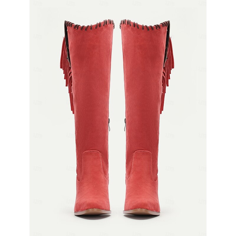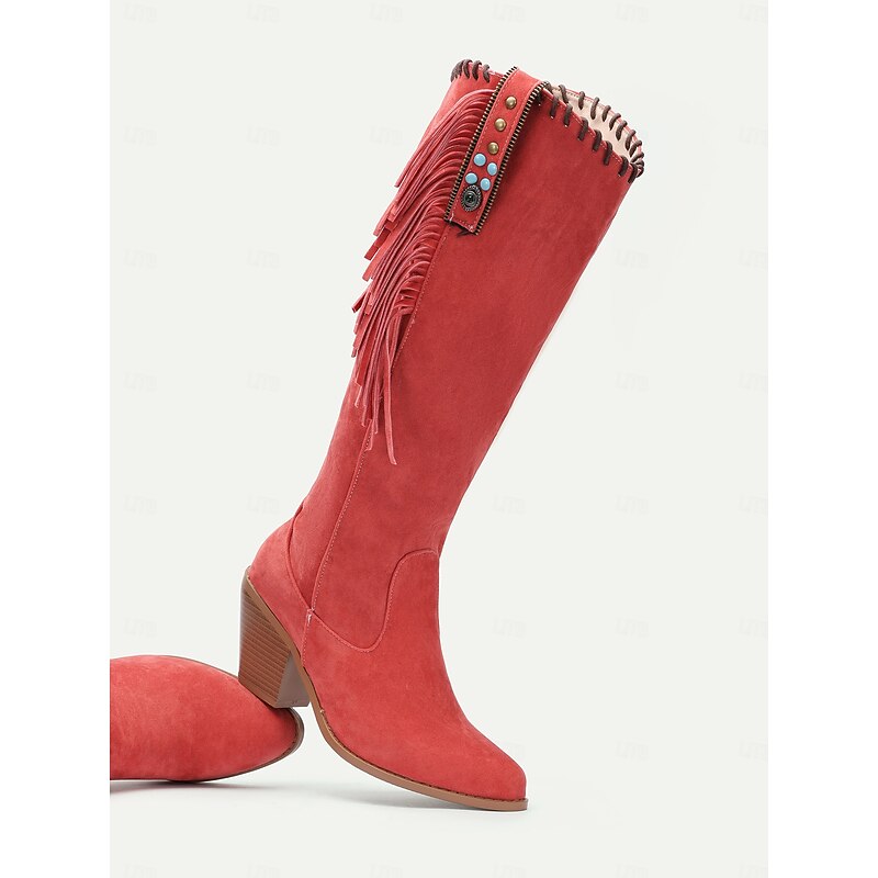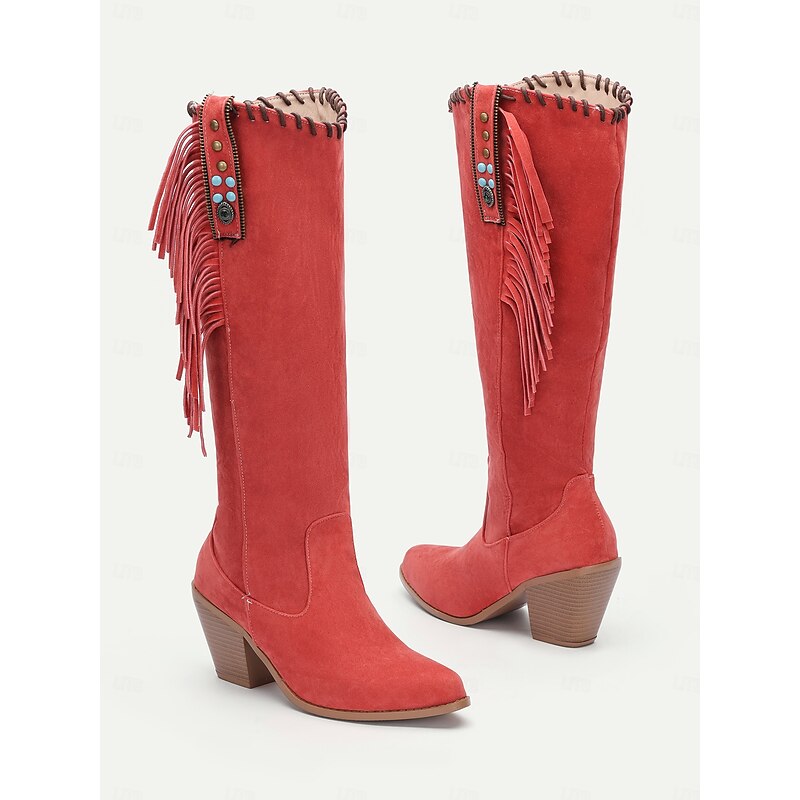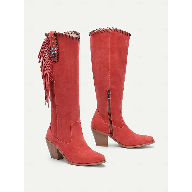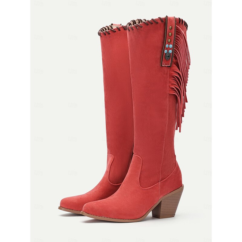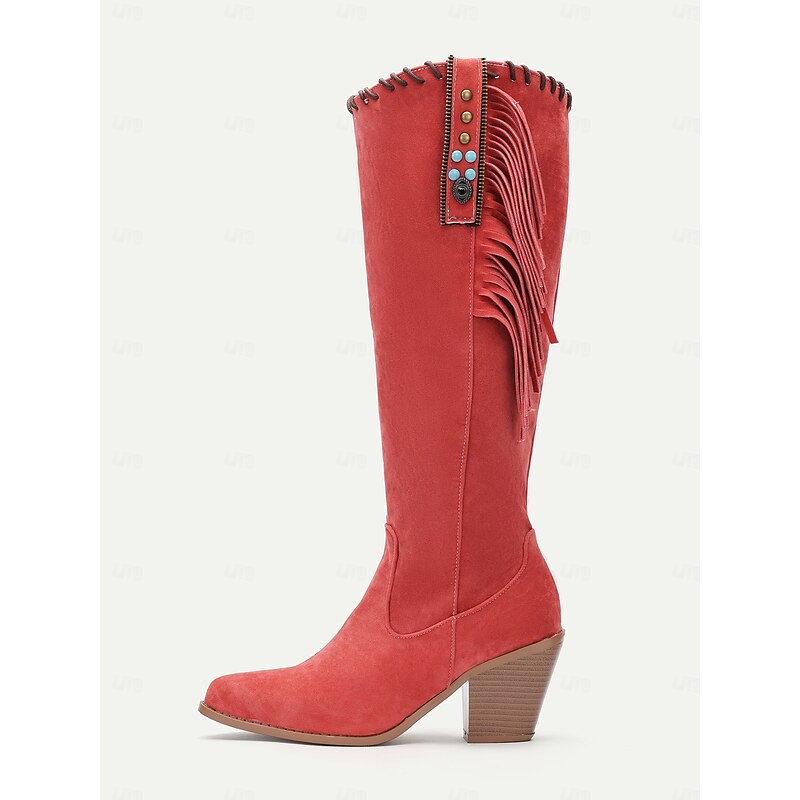Highlights [Fabric and Material] : Crafted from high-quality suede with a polyurethane upper, these boots offer a soft, comfortable feel suitable for fall and winter. The rubber outsole ensures durability and better grip for daily and outdoor activities. [Silhouette] : Featuring a knee-high, elegant vintage style, these boots are designed with a mid-height block heel that gives both a comfortable lift and a stylish appearance. The round toe design adds to the overall comfort without compromising on style. [Design Highlights] : The boots are accented with distinctive Western-style fringe details and embellished with tassels and decorative studs, including eye-catching turquoise embellishments. An inner zipper provides convenience and ease of wear, while maintaining their boho-chic allure. [Occasions] : These boots brilliantly complement both casual and semi-formal outfits, making them ideal for daily wear or outdoor adventures. Their versatile design is perfect for enhancing a bohemian vibe or adding a touch of rustic charm to your look. [Size Notice] : Available in a variety of sizes ranging from US5.5 to US10.5, these boots accommodate a wide range of foot sizes, ensuring a perfect fit for stylish, comfort-conscious women.