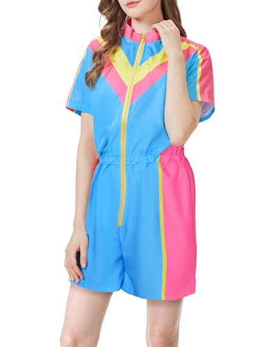 HOT ! 80s Outfit for Women Color Block One Piece Windbreaker Outfits for Women Neon Short Sleeve Zip Front Elastic Waist Jumpsuit