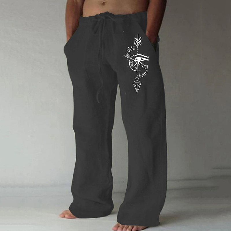 These trousers stand out with tribal-inspired graphic designs of feathers and a compass on the left leg, infusing a unique artistic flair. The elasticated waistband with an adjustable drawstring provides a customizable and secure fit, while convenient side pockets enhance practicality for everyday use.