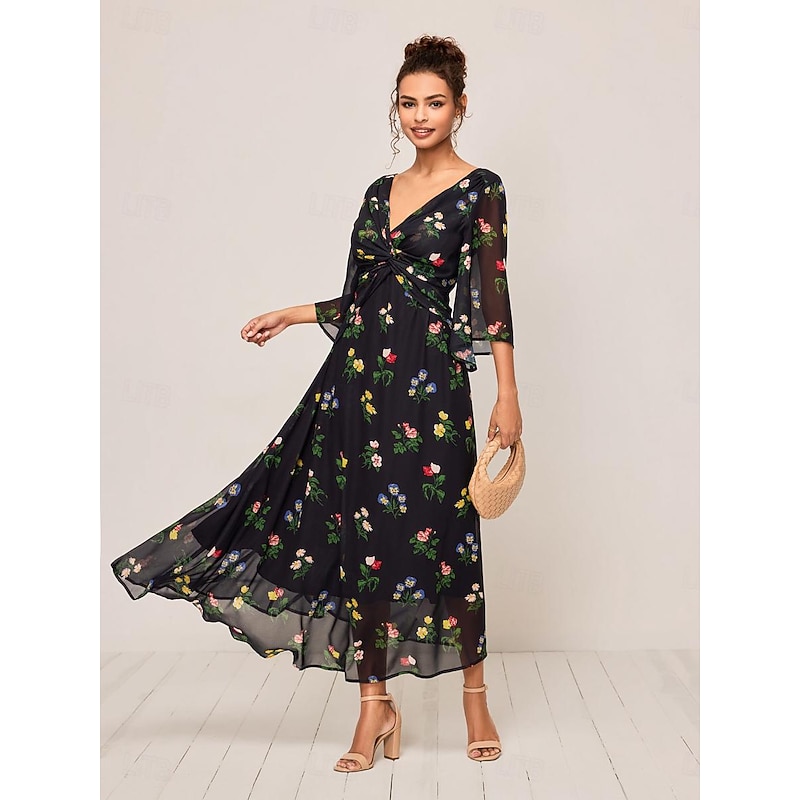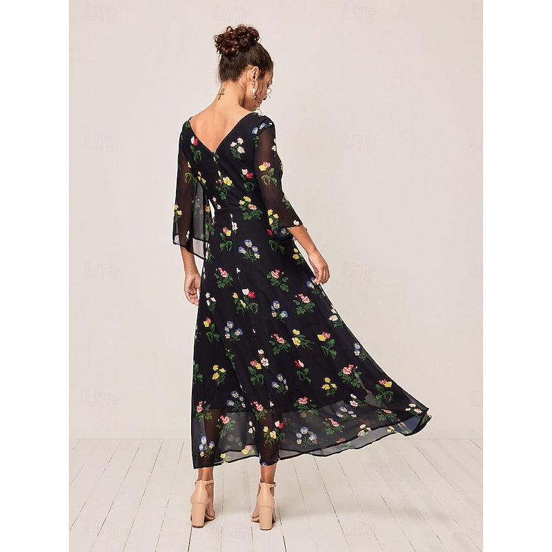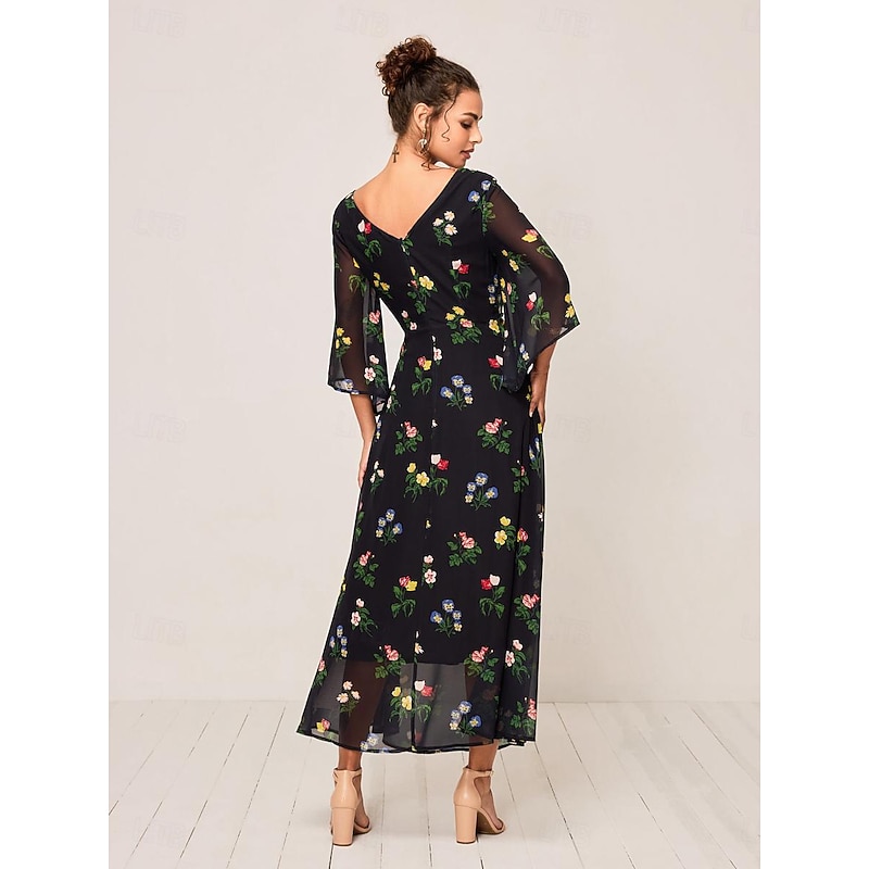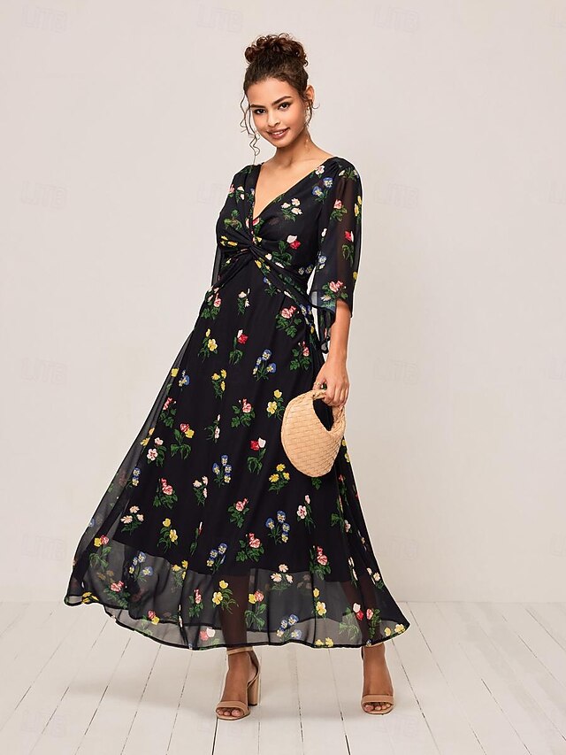 HOT ! Women's Maxi Dress A Line Dress Elegant Stylish Flared Sleeve Wedding Guest Daily Cocktail Party Regular Fit Floral 3/4 Length Sleeve V Neck Black Summer Fall
