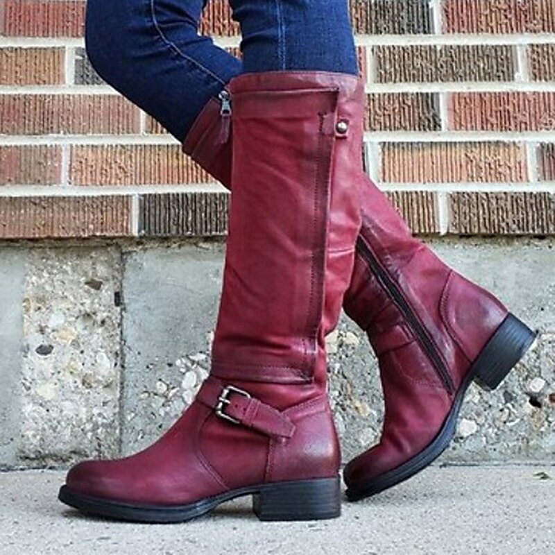 More information about Women's Purple Knee-High Riding Boots with Buckle Strap, Vintage Faux Leather Style for Casual Fall Outfits, Outdoor Walking and Horseback Riding