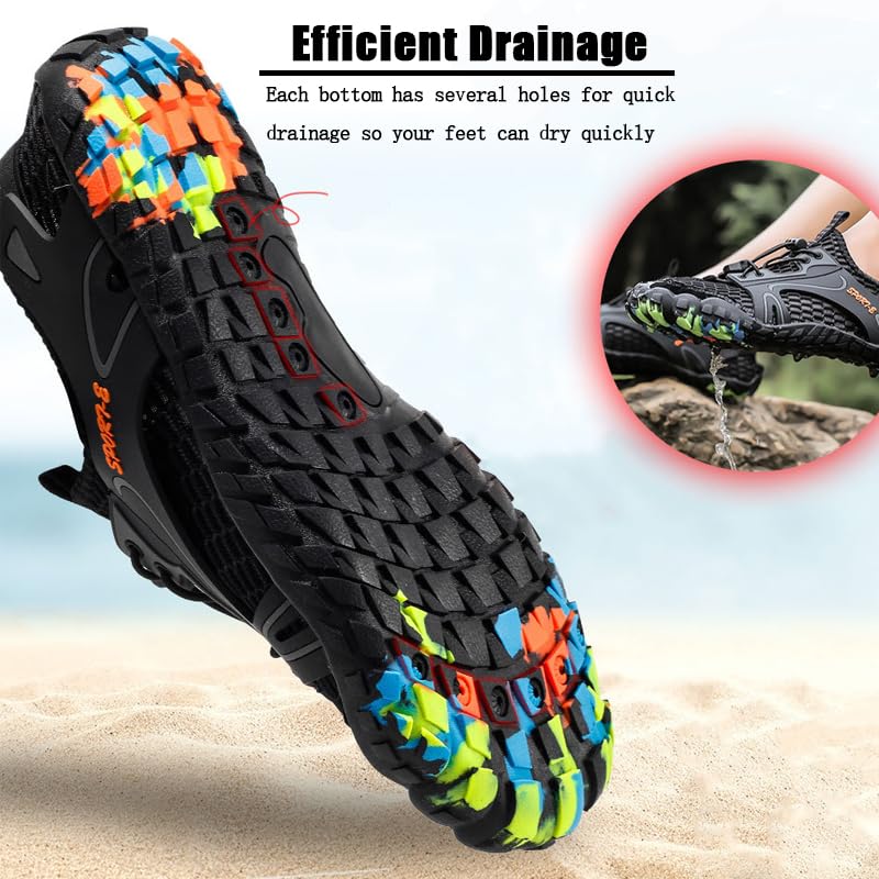 • [Foot Safety & Comfortable] -- The rubber soles of mens water shoes, with a really comfortable and thick foam arch-support insert inside of them, are flexible yet thick enough to protect your feet from stepping on rock and stone.