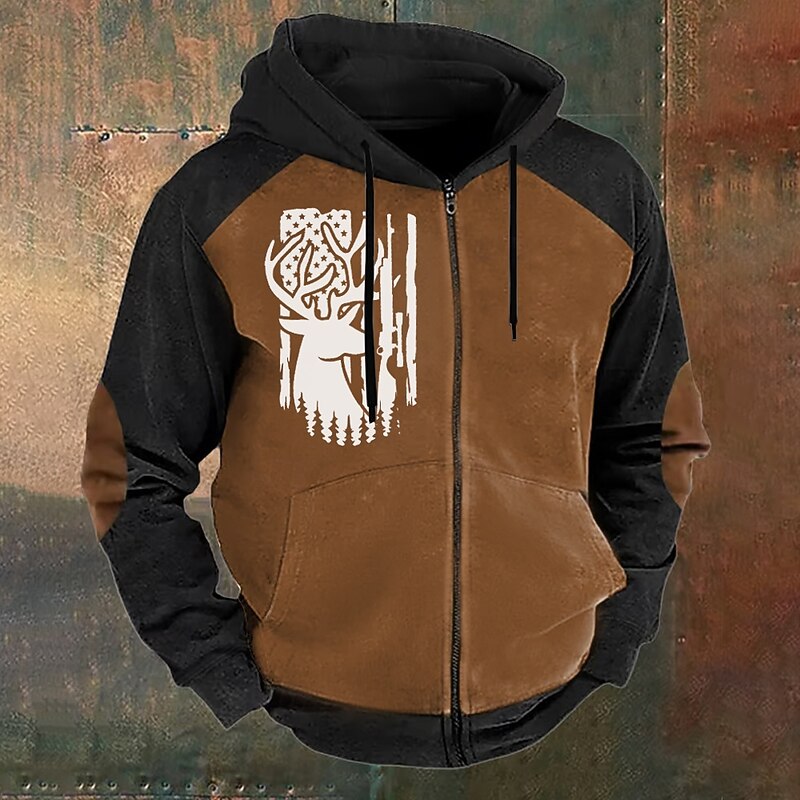 HOT ! Men's American US Flag Deer Hoodies Fashion Daily Long Sleeve Hooded Vacation Hunting Black Brown Drawstring Zipper Fall Winter Designer