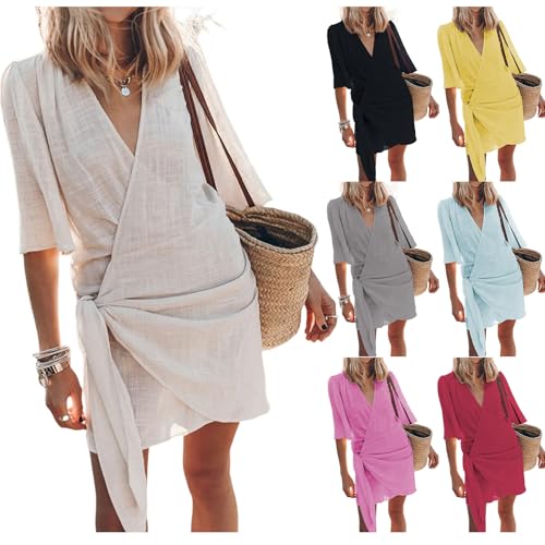 More information about Womens Summer Linen Dresses V-Neck Short Sleeve Wrap Tie Mini Dress Beach Vacation Cocktail Dress