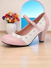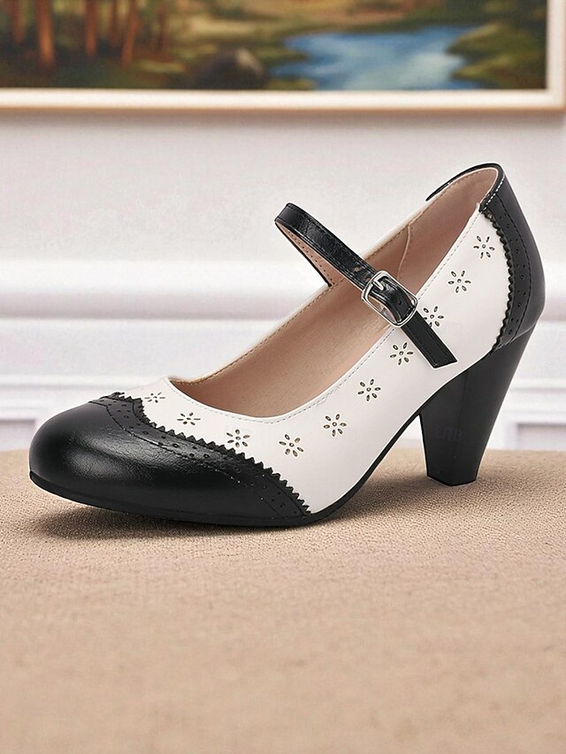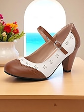 More information about Women's 1950s Vintage Mary Jane Chunky Heel Pumps – Two-Tone Brown and White Brogue Style with Floral Cutouts, Ideal for Vintage Outfits, Office Wear, and Tea Parties