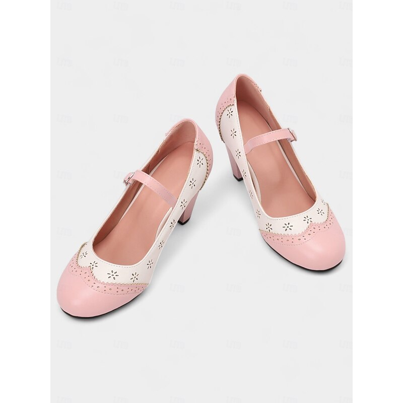 Women's 1950s Vintage Mary Jane Chunky Heel Pumps – Two-Tone Brown and White Brogue Style with Floral Cutouts, Ideal for Vintage Outfits, Office Wear, and Tea Parties 21