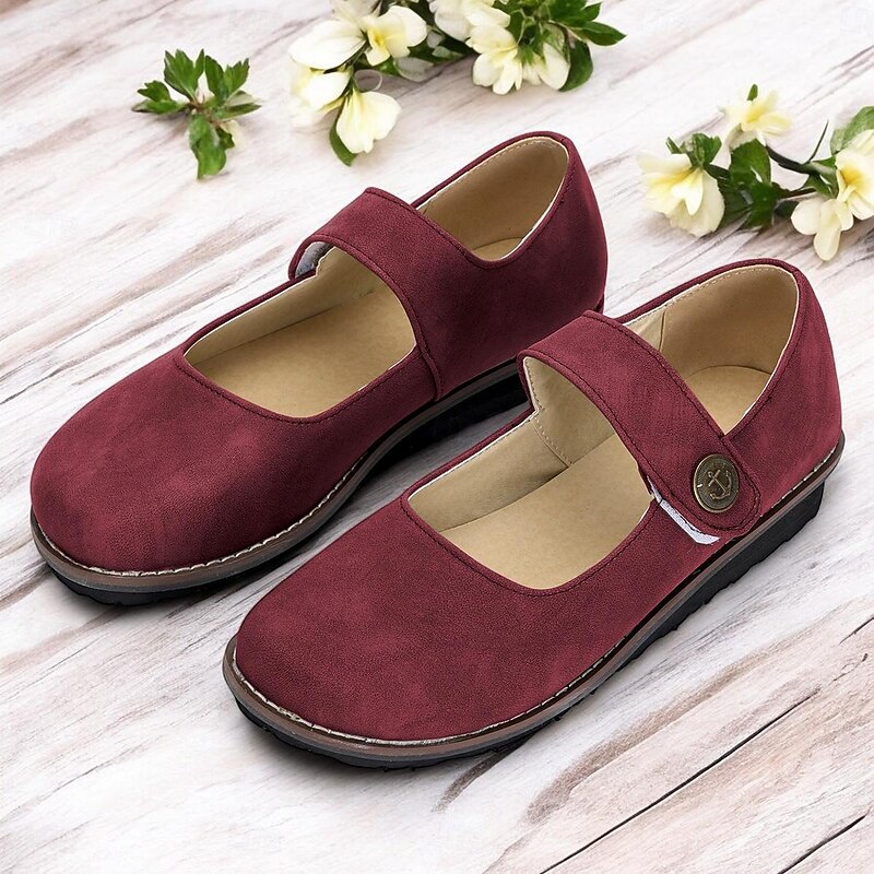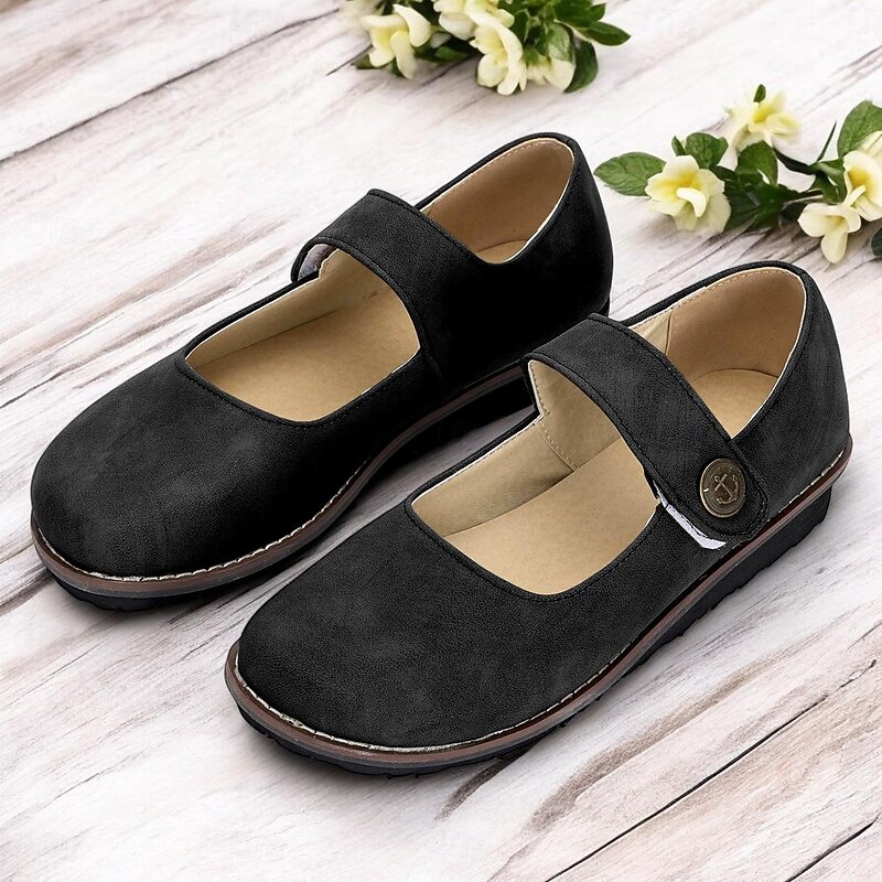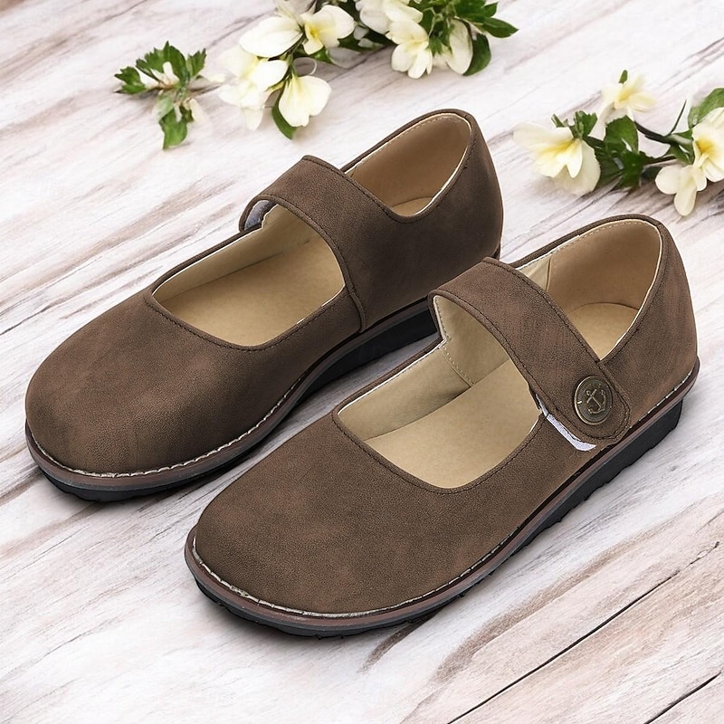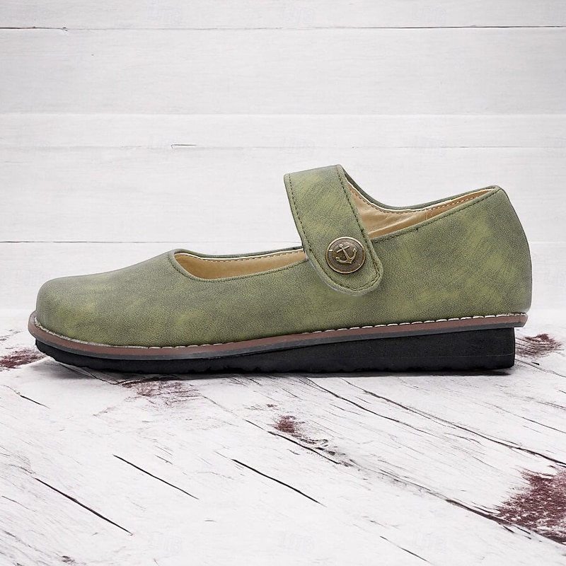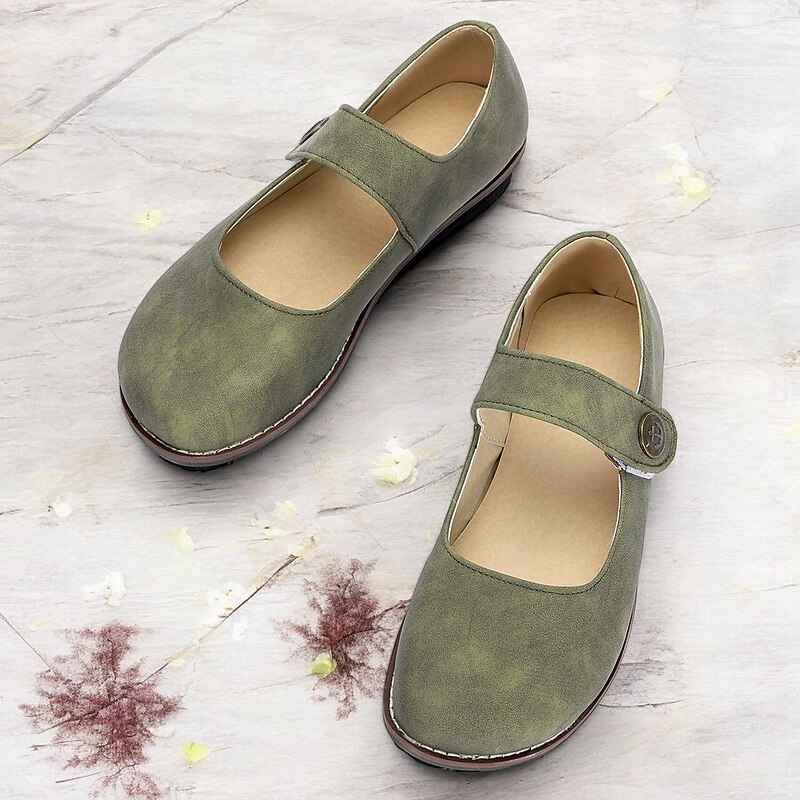 Highlights [Fabric] : Crafted from premium faux suede, these Mary Jane flats offer a soft and luxurious feel, while the synthetic leather lining ensures durability and comfort during wear. [Style and Fit] : Designed in a vintage style with a comfortable flat heel, these shoes feature a classic rounded toe and a single strap across the top, fastened with a button for added elegance. The muted green hue provides an earthy tone perfect for various outfits, making them a versatile choice for everyday wear. [Design Highlights] : These flats showcase a timeless Mary Jane silhouette, with an ankle strap closure and vintage-inspired texture. The cushioned insole enhances comfort, while the durable rubber outsole provides stability and grip for reliable daily wear. [Occasions] : Ideal for daily use and outdoor activities, these shoes are perfect for those seeking a blend of style and practicality. Whether strolling through the park or heading to a casual outing, these flats are suitable for spring and summer seasons. [Size Notice] : Available in a range of sizes from US6 to US10.5, these flats are designed to accommodate standard sizing. For individuals with wider feet, it is recommended to choose one size up to ensure the best fit.