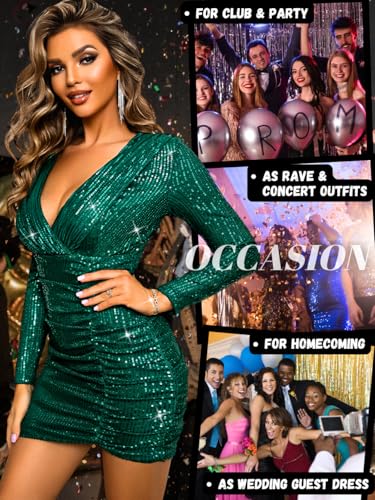 HOT ! Kaei&Shi Sequin Cocktail Dresses,Deep V Neck Long Sleeve Mini Dress for Women,Sexy Sparkly Outfits Birthday Party Night Club
