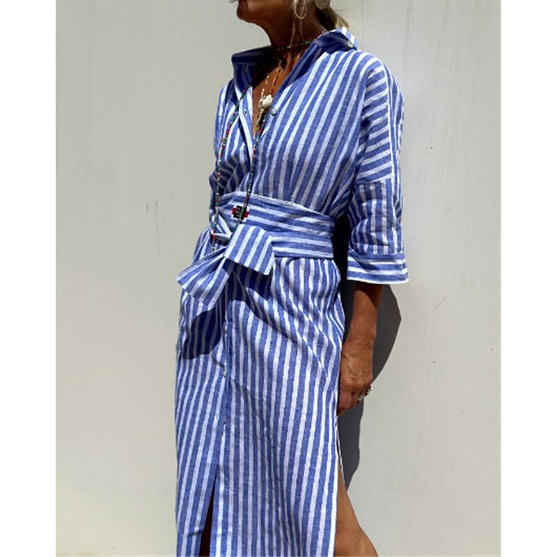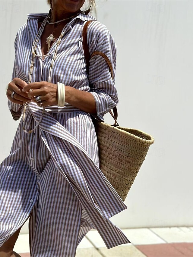 More information about Women's Midi Dress Linen-Inspired Dresses Shirt Dress Casual Dress Fashion Modern Daily Beach Weekend Regular Fit Striped Long Sleeve Shirt Collar Pink Light Brown Blue Summer Spring