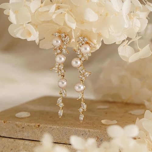 Dangle Earrings for Women, 14k Gold Plated Pearl Drop Earring With Diamond Dainty Gold Earrings for Women Trendy Cute Prom Bridal Earring Long Wedding Earring Formal Jewelry 5