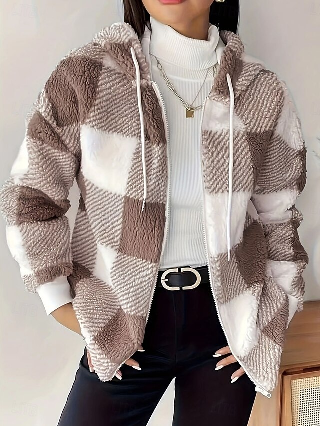 More information about Women's Fleece Jacket Teddy Coat Comfortable Breathable Pocket Buttons Print Casual Plaid Vacation Street Casual Daily Wear Zipper Regular Hooded Regular Fit Long Sleeve Outerwear Brown Spring Fall