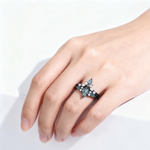 HOT ! Black Moss Agate Engagement Ring Set for Women - Custom Kite Cut Moss Agate Wedding Ring, Personalized Promise Ring for Her Wife Bridal