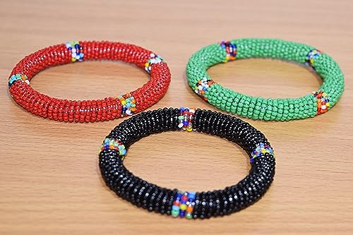HOT ! Tembo Crafts Africa - Set of 3 Handmade Bangles for Women - Beaded Bracelets - Boho Jewelry Gifts - Red Green Black - Handmade From Africa