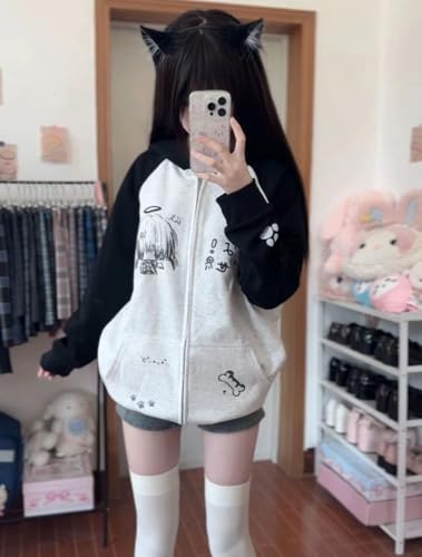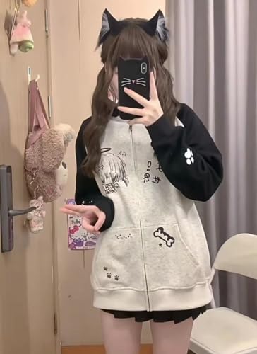 More information about Y2k Kawaii Cartoon Anime Paw Print Harajuku Grunge Baggy Zip Up Hoodies Vintage Cutecore Preppy Loose Casual Jacket