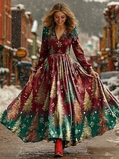 More information about Christmas Women's Maxi Dress Pleated Dress Party Casual Boho Daily Date Going out Regular Fit Christmas Tree Long Sleeve V Neck Burgundy Green Fall Winter