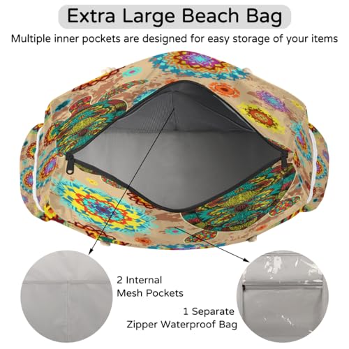 HOT ! Painted Turtle Mandalas Beach Bag for Women Waterproof Sandproof Tote with Zipper Cotton Rope Handles for Travel Pool Gym Shopping