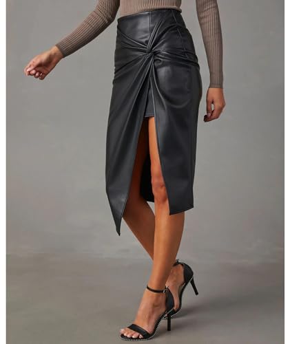 SEMATOMALA Women's High Split Wrap Twist Faux Leather Midi Skirt Casual Business Elegant PU Leather Pencil Skirts 6