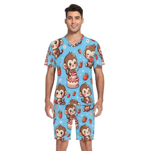 Men's Pajama Set Cute Monkey Strawberries Cake Short Sleeve with Shorts Pockets Sleepwear Set Summer Loungewear 1