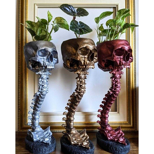 HOT ! Halloween Skull Planter & Spine Stand, Resin Skull Head Flower Succulent Cactus Planter Pots,or Home Office Desk Decorations Halloween Scene Statue Sculpture Decorations
