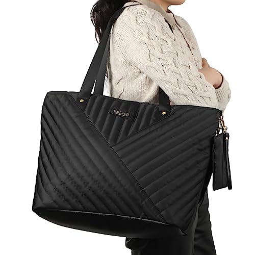 • CUSTOM DESIGN: This weekender tote features a black quilted fabric design while gold letters spell out the designer's logo on the front and exterior zippers. The bag measures 21" W x 14" H x 7" D. Rachel Rachel Roy fans will love this design.