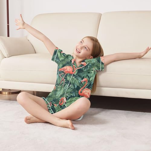 ALAZA Tropical Retro Flamingo Palm Leaves Green Pajamas Satin Pajama Set Short Sleeve Button Down Sleepwear 2