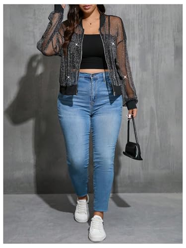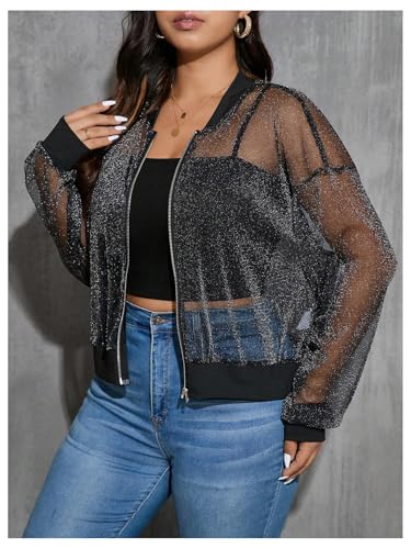 Floerns Women's Plus Size Glitter Long Sleeve Mesh Coats Zip Up Sheer Bomber Jackets 6