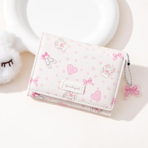 HOT ! Small Wallet Bunny Floral Heart Coquette Bow Print Wallet with ID Credit Card Slots for Women Girls (CREAM)