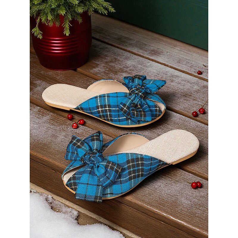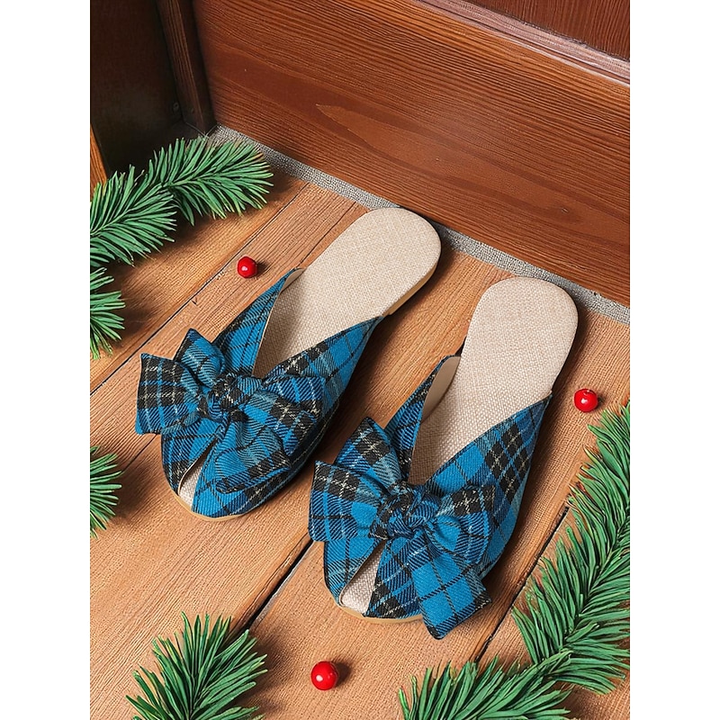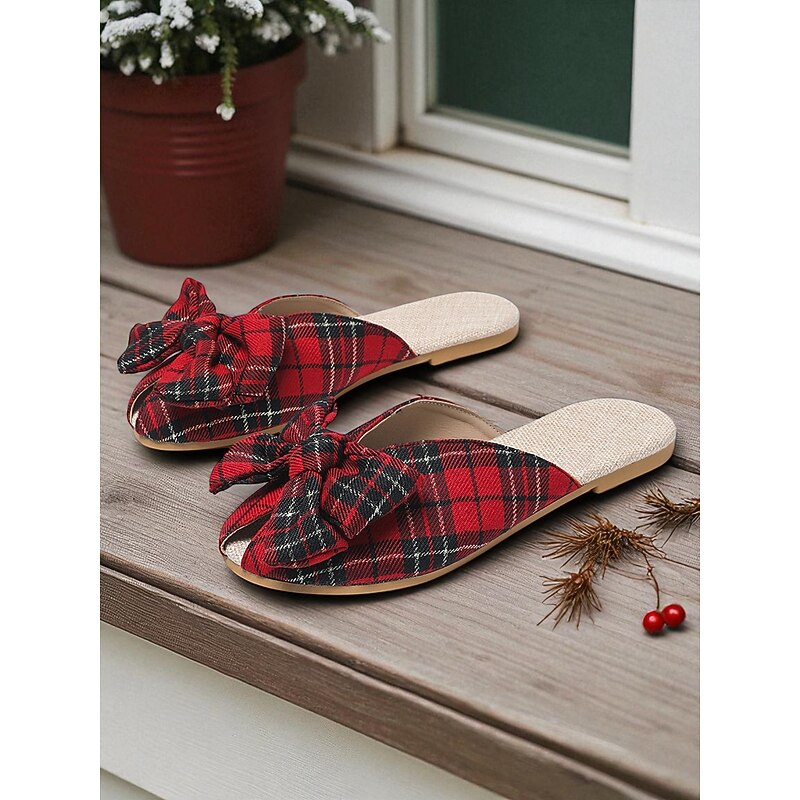 HOT ! Women's Red Plaid Bow Knot Slip-On Mules, Festive Indoor Christmas Party and Holiday Gathering Shoes