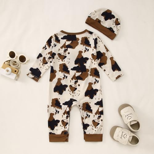 BOUTIKOME Infant Baby Boys Cow Outfits Cute Cow Graphic Jumpsuit Romper Long Sleeve Bodysuit Onesie Hat 2PCS Set Fall Clothes 1