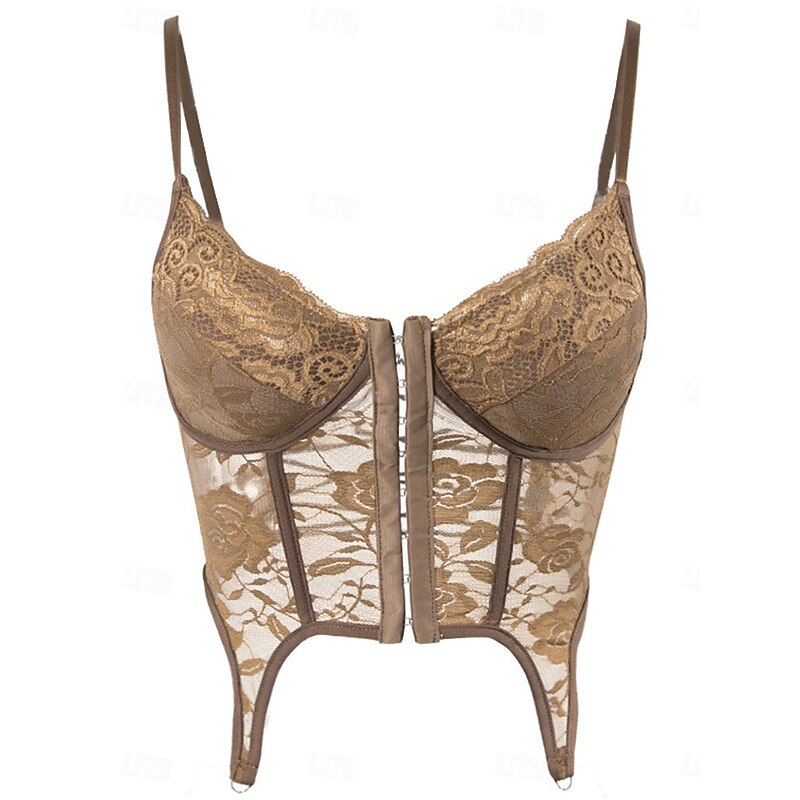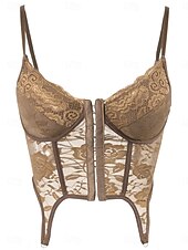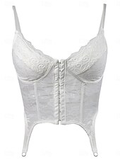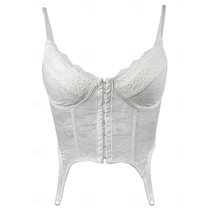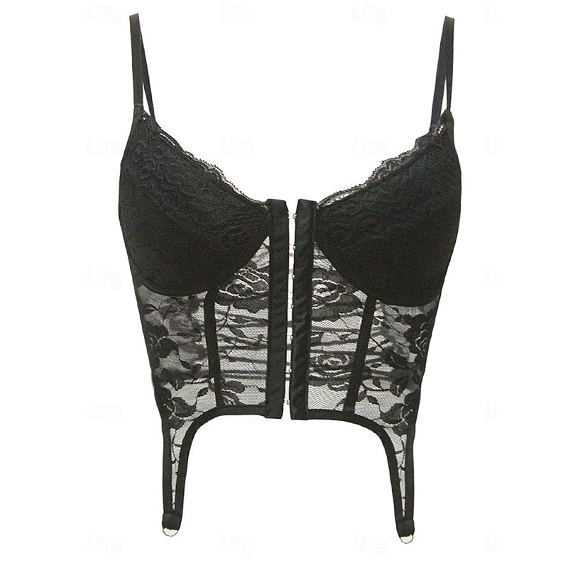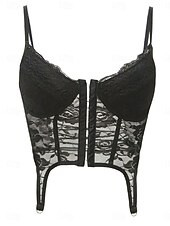 Highlights [Fabric] : Crafted from a high-quality polyester, this women's bustier top features a delicate lace blend that is both breathable and comfortable, ideal for extended wear during any season. [Silhouette] : Designed with a structured boned corset, this top offers excellent support and a flattering, cinched silhouette that highlights the natural curves beautifully. [Design Highlights] : The bustier sports an alluring backless design, intricate lace detailing, and adjustable thin straps for a personalized fit. The front hook-and-eye closure adds a touch of classic elegance, while the integrated chest pads provide additional comfort and support. [Occasions] : Perfect for a variety of occasions including carnival parties, romantic dates, festive gatherings, and Valentine's Day celebrations. This versatile piece can be effortlessly paired with high-waisted skirts or pants, making it a chic choice for any fashion-forward event. [Size Range] : Available in sizes S, M, and L, catering to a wide range of body types and ensuring a comfortable fit for all.