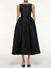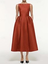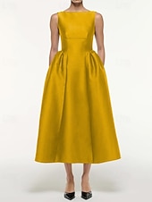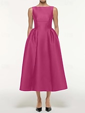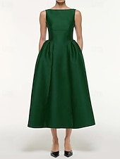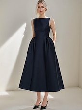More information about A-Line Cocktail Dresses Elegant Dress Formal Wedding Tea Length Sleeveless Boat Neck Satin with Pleats Pocket