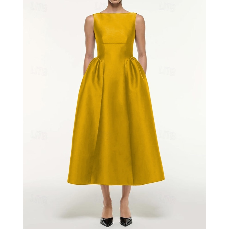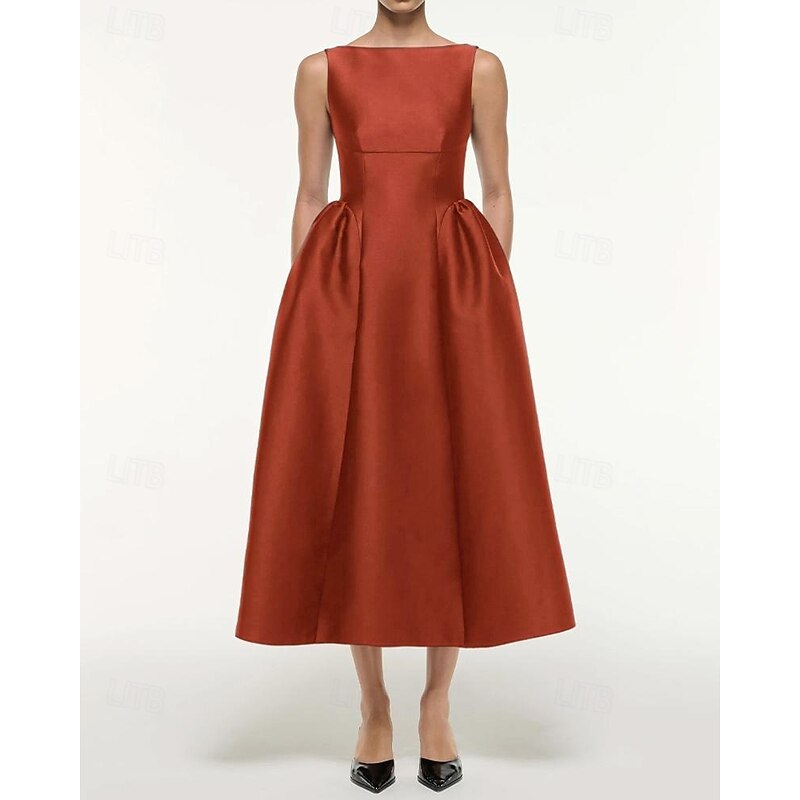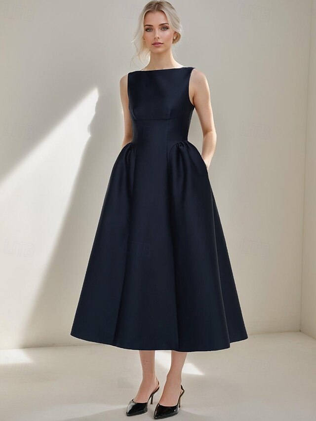 HOT ! A-Line Cocktail Dresses Elegant Dress Formal Wedding Tea Length Sleeveless Boat Neck Satin with Pleats Pocket