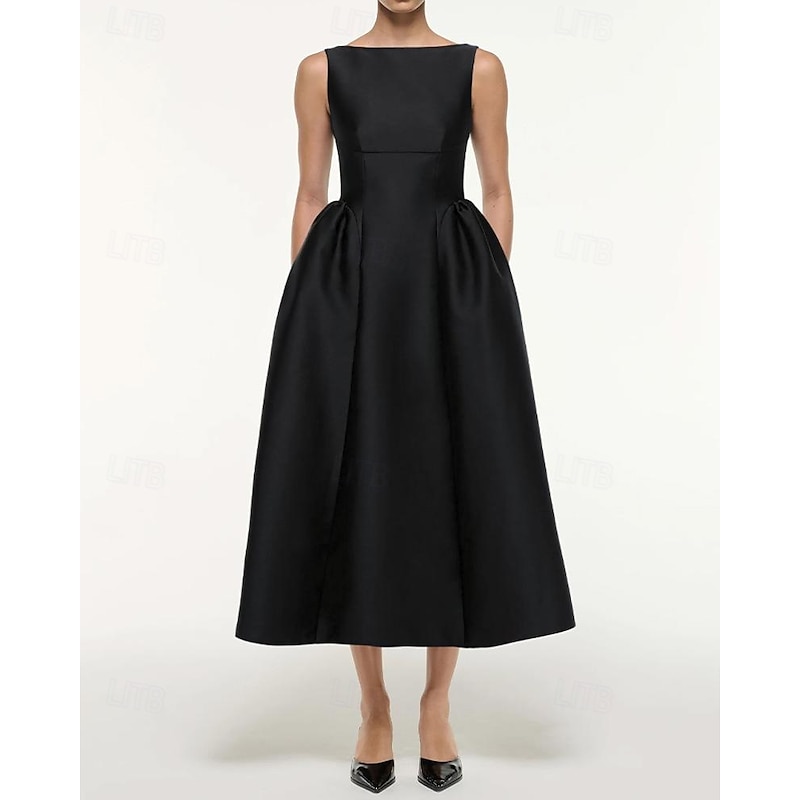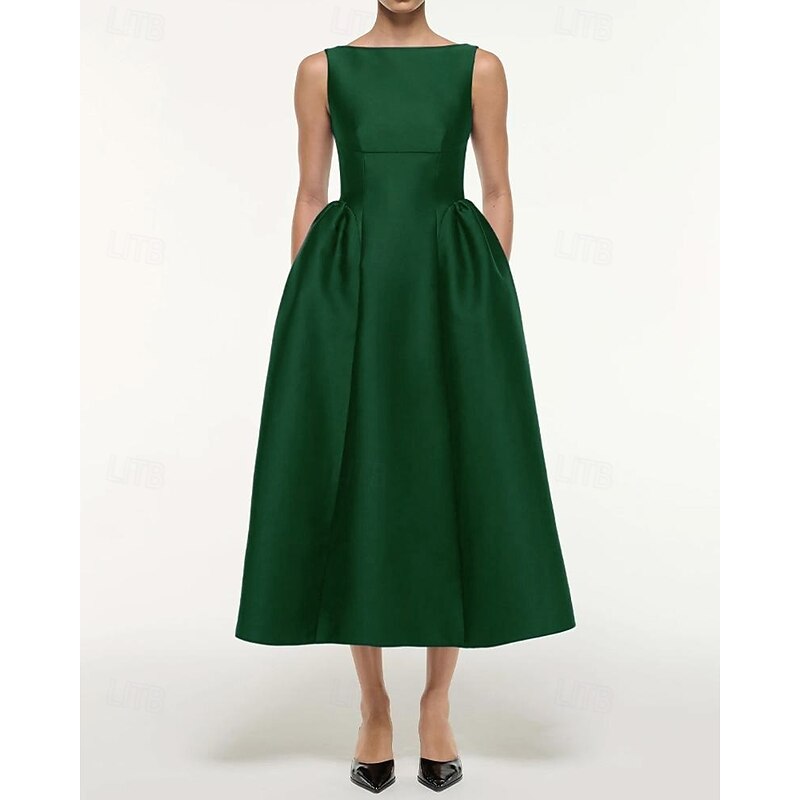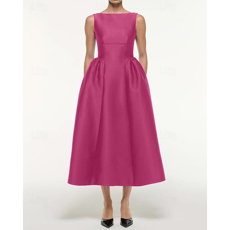 A-Line Cocktail Dresses Elegant Dress Formal Wedding Tea Length Sleeveless Boat Neck Satin with Pleats Pocket 1