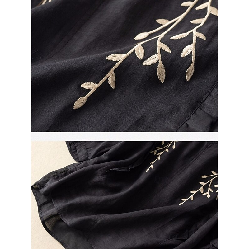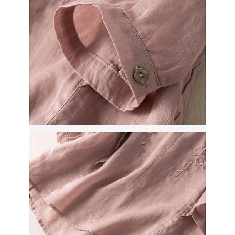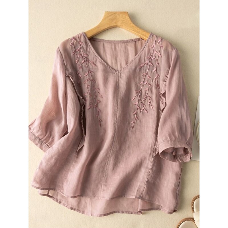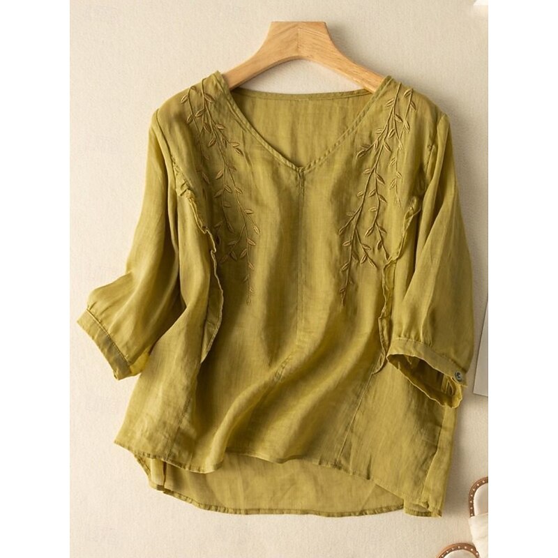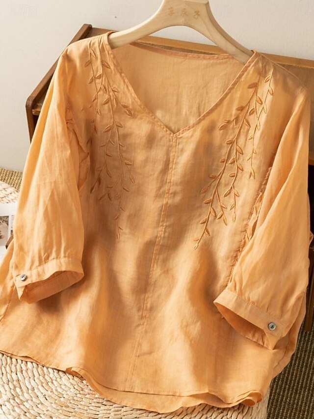More information about Women's Cotton Linen Shirt Floral Basic Ethnic Casual 3/4 Length Sleeve V Neck Regular Tops Daily Embroidered Yellow Navy Blue Purple Orange Apricot Summer