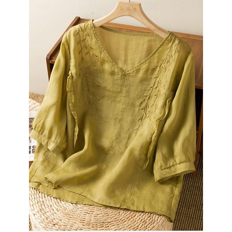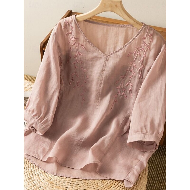 HOT ! Women's Cotton Linen Shirt Floral Basic Ethnic Casual 3/4 Length Sleeve V Neck Regular Tops Daily Embroidered Yellow Navy Blue Purple Orange Apricot Summer