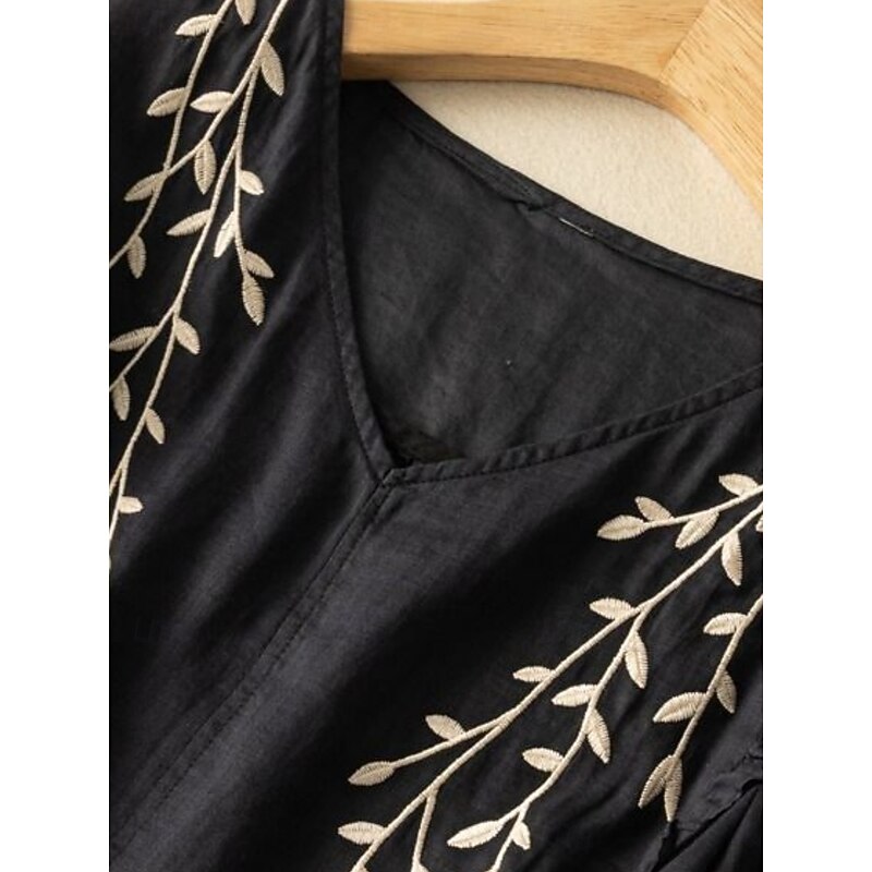 Women's Cotton Linen Shirt Floral Basic Ethnic Casual 3/4 Length Sleeve V Neck Regular Tops Daily Embroidered Yellow Navy Blue Purple Orange Apricot Summer 7