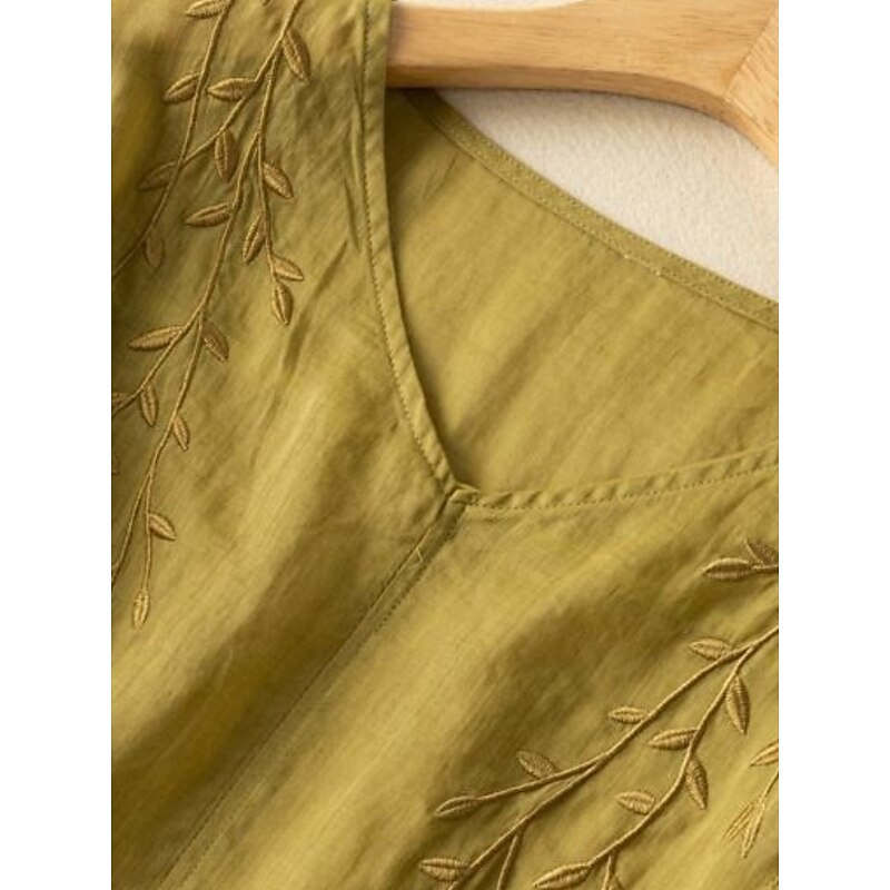 Women's Cotton Linen Shirt Floral Basic Ethnic Casual 3/4 Length Sleeve V Neck Regular Tops Daily Embroidered Yellow Navy Blue Purple Orange Apricot Summer 15