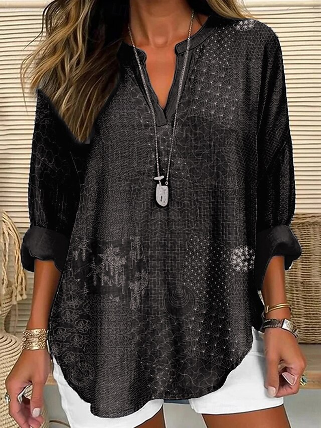 More information about Women's Shirt Geometric Color Block Stylish Modern Long Sleeve V Neck Regular Tops Daily Holiday Buttons Print Maroon Black Blue Brown Summer