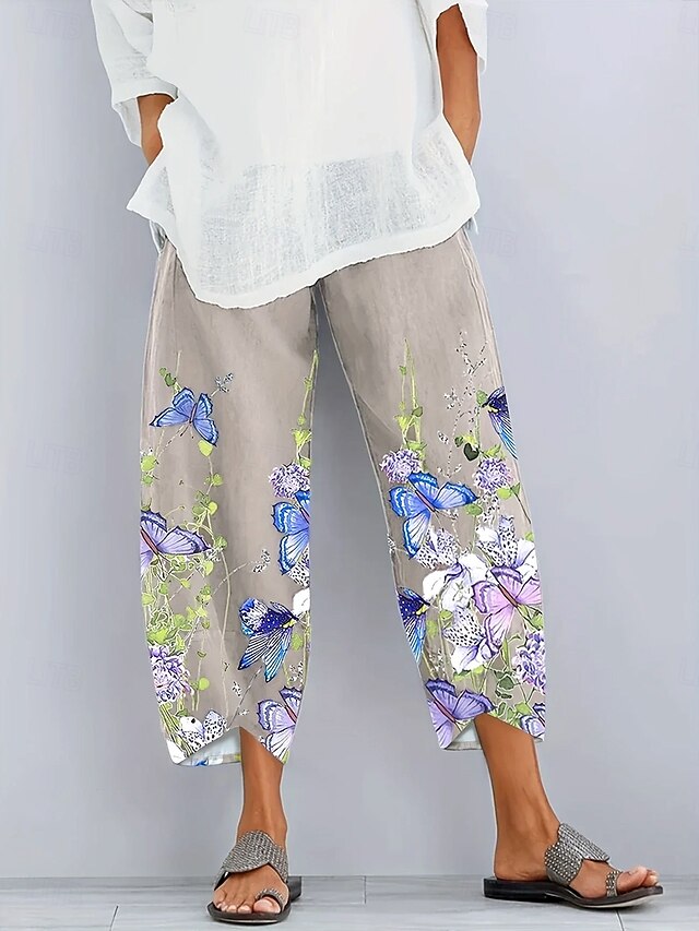 HOT ! Women's Chinos Baggy Pants Vacation Vintage Ethnic Style Full Length High Waist Floral Graphic Butterfly Drawstring Patchwork Printing Breathable Micro-elastic Vacation Street Causal Gray Green Light