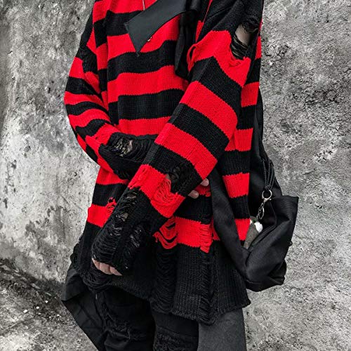 HOT ! Black Red Striped Sweaters Men Oversized Ripped Hole Knit Pullover Autumn Winter Fashion Long Sleeve Clothing