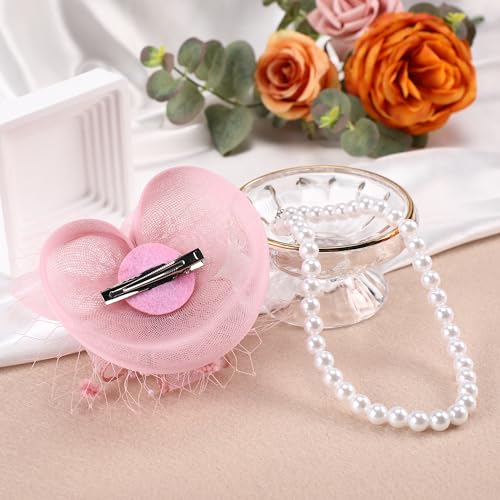 Cute Mini Fascinator Hats - Pink Mini Elegant Veil Mesh Hat with Pearl Necklace Set for Women Girls, Little High Tea Party Kentucky Fascinator with Clip for 1920s 50s Accessories 2
