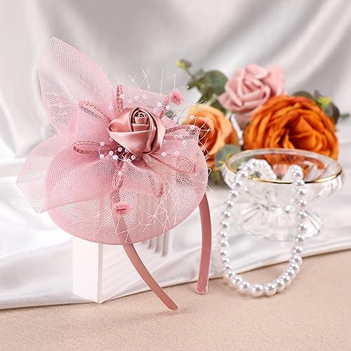 Cute Mini Fascinator Hats - Pink Mini Elegant Veil Mesh Hat with Pearl Necklace Set for Women Girls, Little High Tea Party Kentucky Fascinator with Clip for 1920s 50s Accessories 1