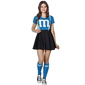 The costume set includes a colorful short-sleeve top adorned with a bold "M" logo, embodying the lively spirit of M&M candy characters. Available in an array of cheerful colors such as red, purple, yellow, green, blue, and pink, the ensemble is sure to catch the eye. The outfit features a classic A-line black skirt that is high-waisted and flares out for a flattering silhouette, complemented by knee-high striped socks that match the top for an extra fun touch. Black sneakers complete the look, adding a casual, sporty appeal.
