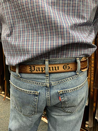 • We use a laser engraver to burn the name into the leather, then apply a dark antique finish to darken and seal the name. We use a durable lacquer on every belt so no need to use any oils, they are ready to wear